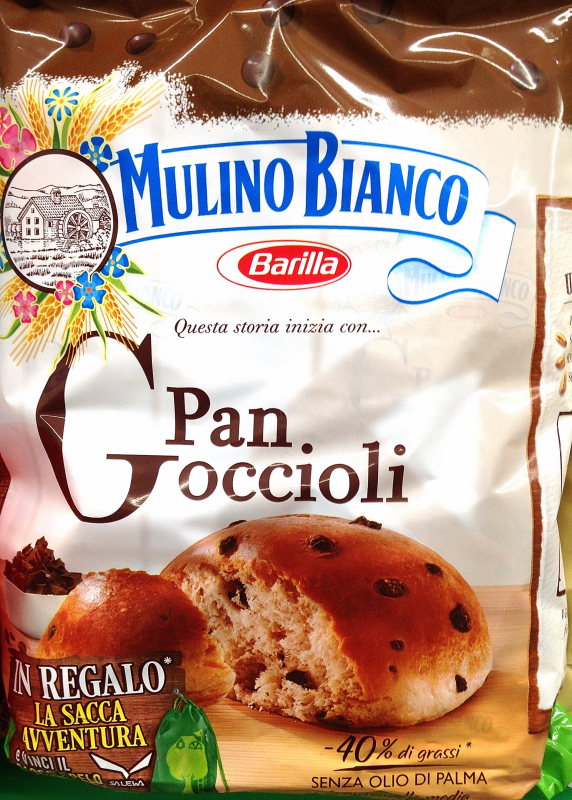 Mulino bianco product pangoccioli is sweet bread with chocolate chips, simple ingredients for a healthy and nutritious snack withou palm oil. I pan goccioli della mulino bianco sono contenuti in una bustona color crema che è il colore classico di tutte le confezioni della mulino bianco. In una confezione ci sono 8 panini.